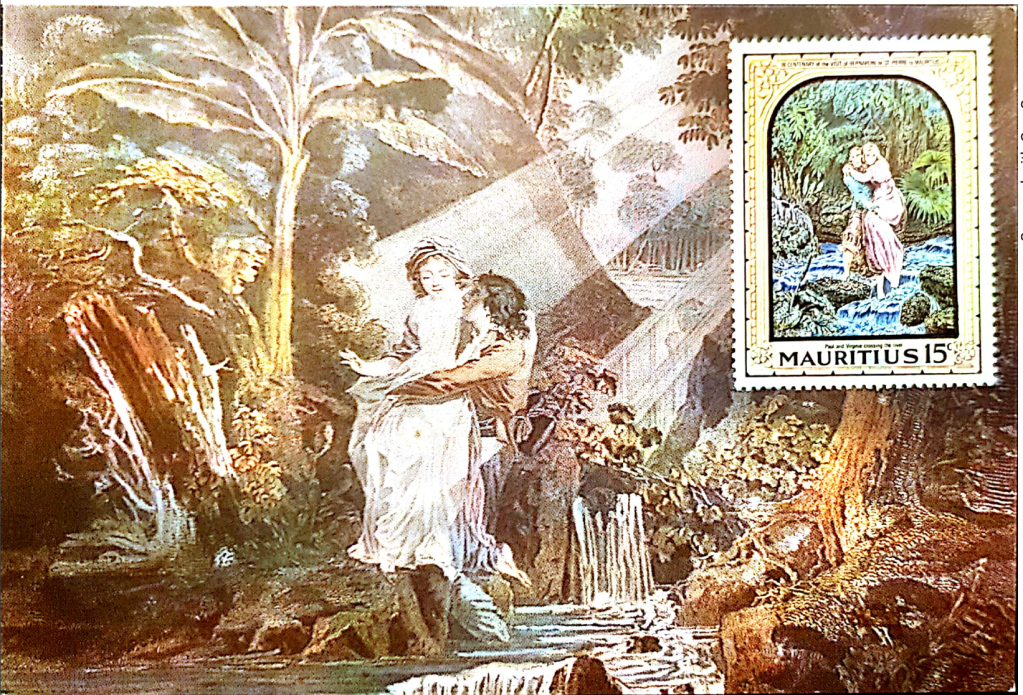 Bernardin de Saint-Pierre lived in Mauritius for a time and based part of his novel on a shipwreck he witnessed there. The story is a fiction. The stamps depict paintings based on the imaginary life of Paul and Virginia.