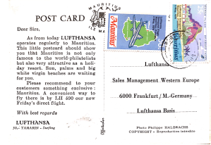 An official first day cover was issued on 2 May 1970 to mark the German company Lufthansa’s inaugural flight from Frankfurt to Mauritius. This was a milestone in the tourism industry in Mauritius.