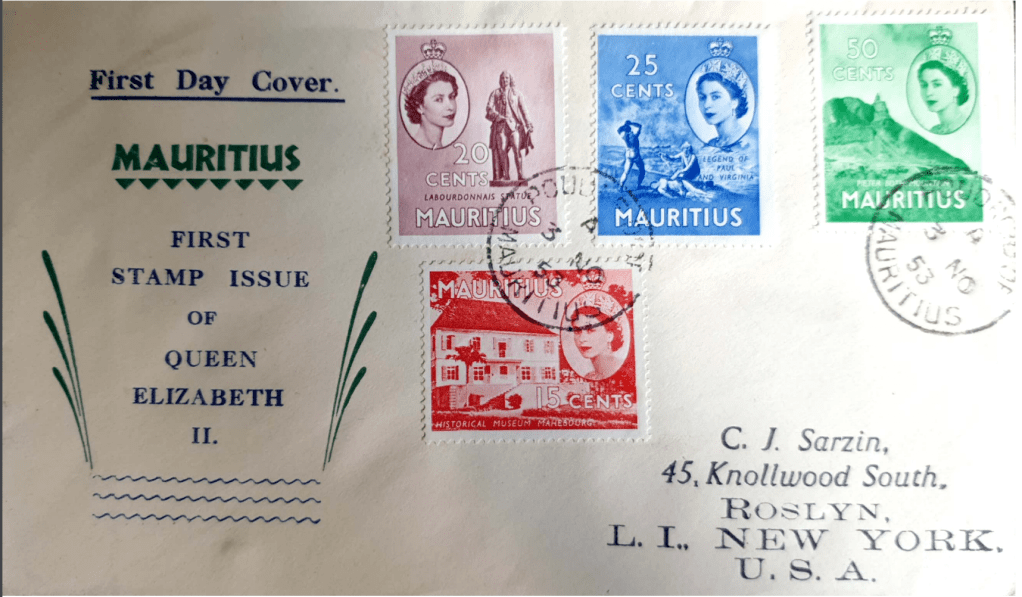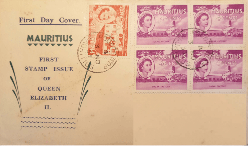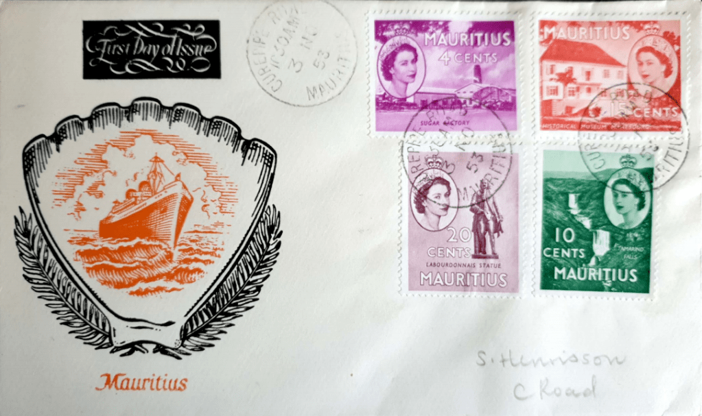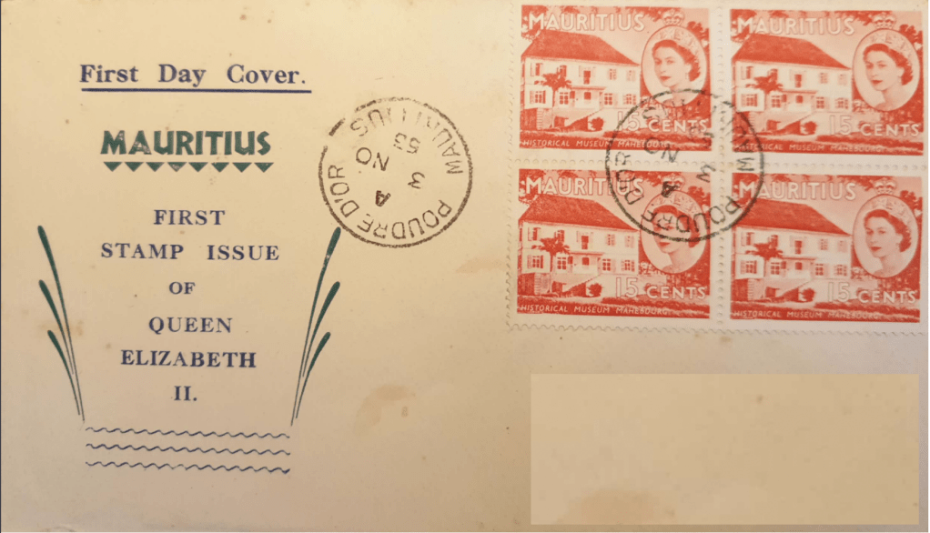 For the first definitive set of 1953, the same designs of the 1950 George VI Pictorial issue was used but the value changed for some stamps. However the mistake in the latitude (on the George VI 12 cent) was corrected on the 60 cent. The only change in the pictorial motif was the ox-drawn cart, which was replaced by the Historical Museum of Mahébourg on the 15c stamp. No official first day cover was released by the GPO.