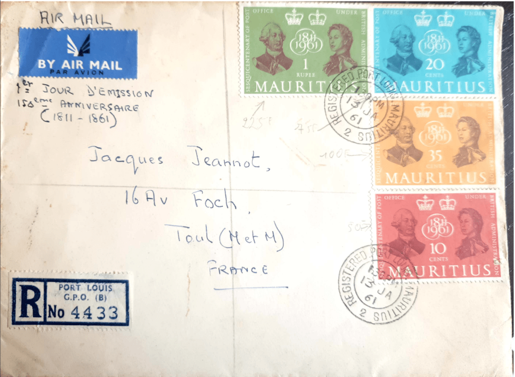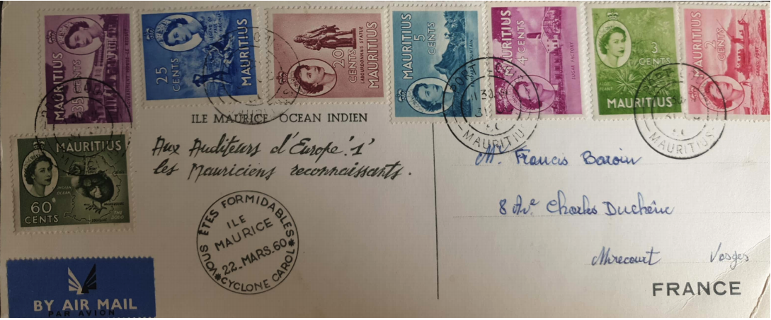In March 1960, Mauritius suffered from a severe cyclone named Carol. A number of houses were destroyed. Friends of Mauritius in France contributed to support people who suffered from material losses. This special thank you post card has a franking that thanks ‘friends of Mauritius’ for their generosity. It was sent to the French radio Europe 1.