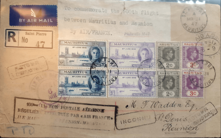 31 March 1947: Unofficial cover to commemorate the 100th Flight between Mauritius and Reunion