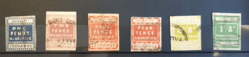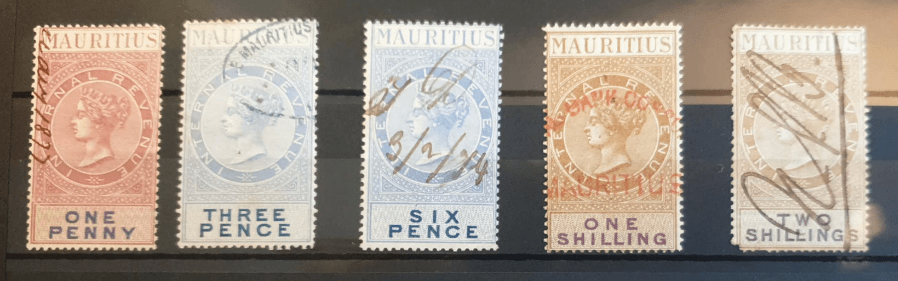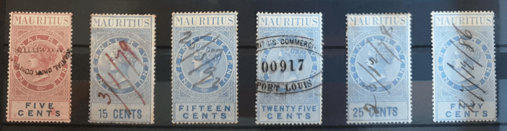 Two examples are shown here. Refer to Revenue Reverend’s main page and supplementary information page on Mauritius for a complete set of this type of stamps.