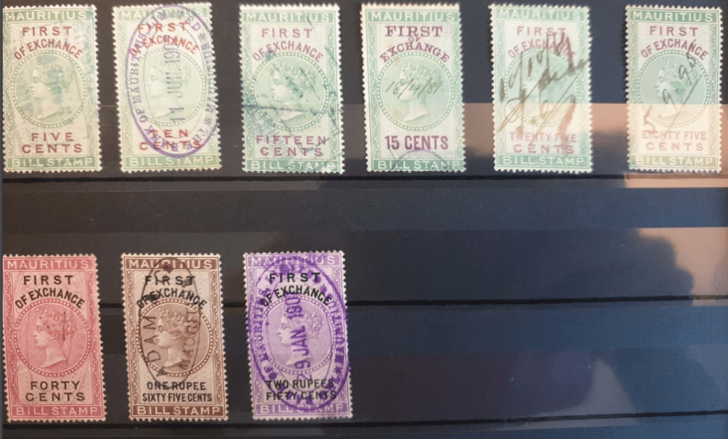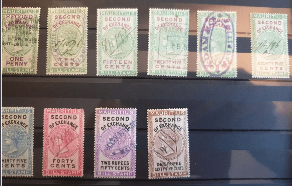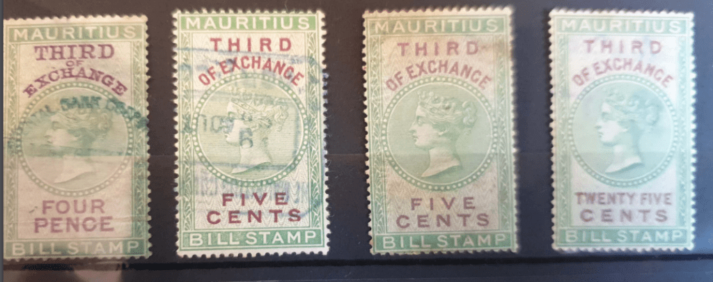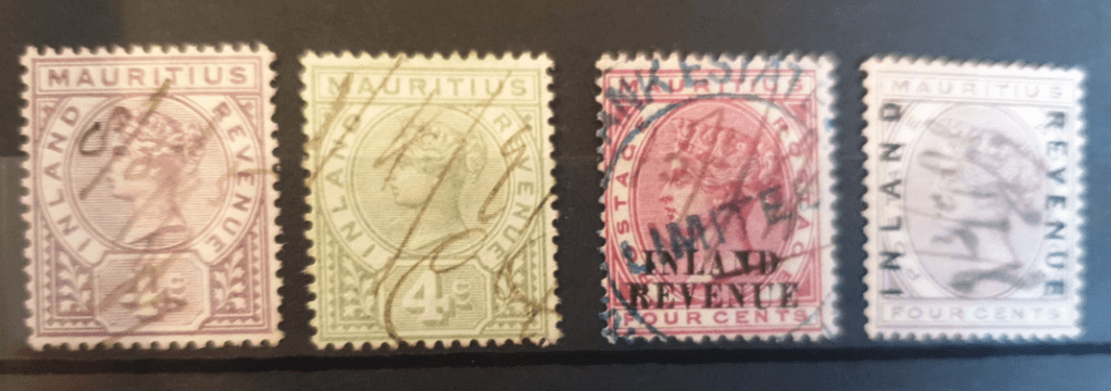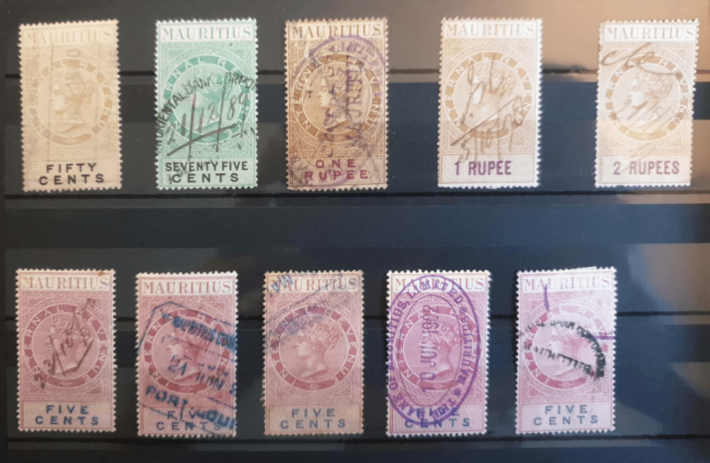 Revenue stamps often look very similar to postage stamps. In Mauritius, specific adhesive labels were used in the mid- 19th century. Then dedicated fiscal stamps were issued. At times, postage stamps were also used for revenue purposes.