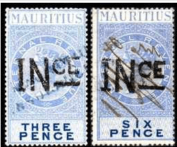 The first insurance stamps were issued in Mauritius on 1 March 1869. These were Queen Victoria postage stamps, handstamped INCE in black. Two examples are shown below. Refer to Revenue Reverend’s main page and supplementary information page on Mauritius for a complete set of insurance fiscal stamps, their date of issues and various varieties of overprints used during that period.